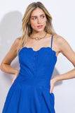 A solid woven jumpsuit featuring scalloped bodice edge, shoulder strap, button down, pleated front pant, wide leg and back zipper closure.
