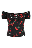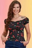 A classic 50s rockabilly top very fitted on body with wide neckline and mini gathered sleeves which can be worn both on and off shoulders.