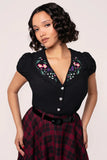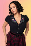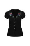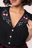 This black viscose blouse features a V-neckline with a pointed collar, trimmed with a delicate black frill and intricate winter floral embroidery.