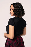 Short puffed sleeves with elasticated cuffs offer both style and comfort, while the button-down front is complemented with contrasting ivory buttons.