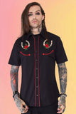 Lucky Horseshoe and red rose embroidery men's black shirt featuring red center front piping along button opening placket and red embroidered arrows