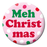 A light pink badge with red, white and green spots surrounding red and green text that reads Meh Christmas.