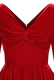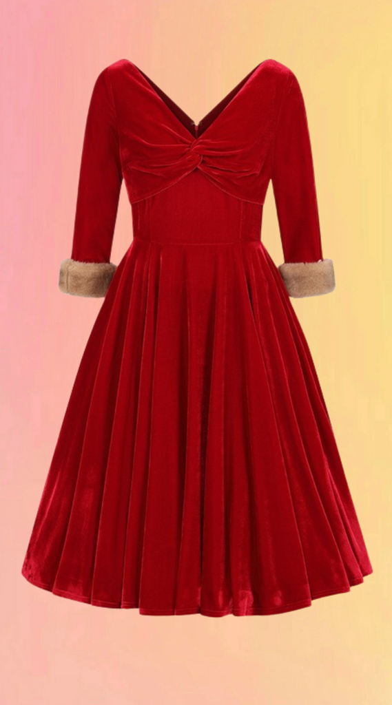 A luxurious velvet swing dress featuring a dramatic twisted bodice, contrasting faux fur sleeves, and full circle skirt with side pockets.