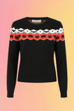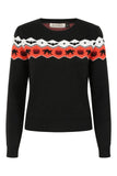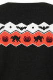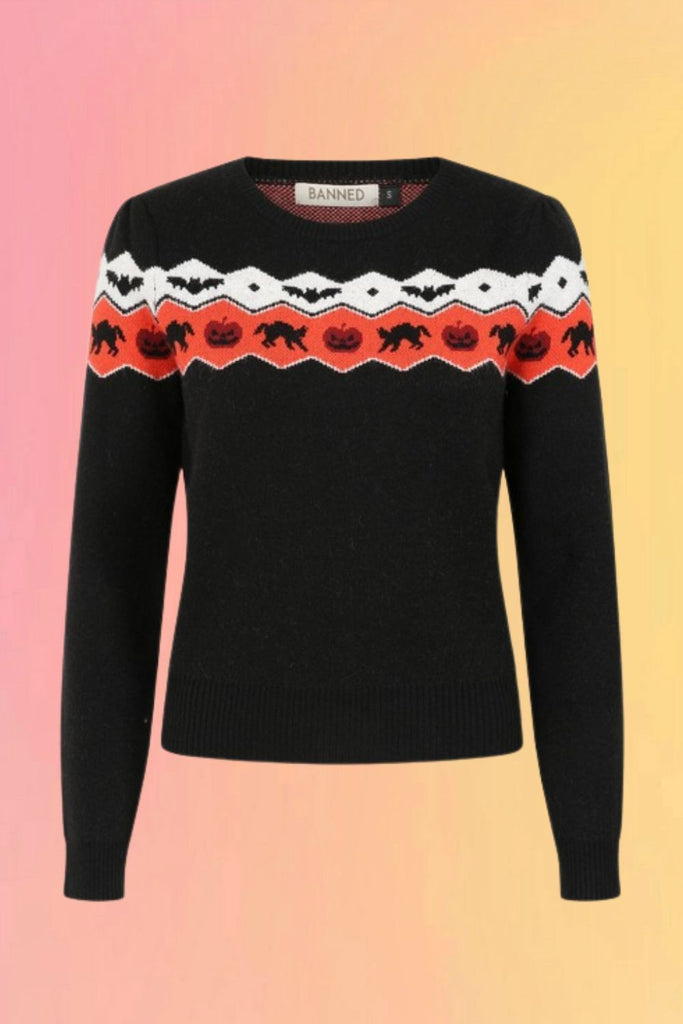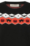 Banned's spooky knit jumper featuring Halloween-themed intarsia across shoulders with black cats and pumpkins.