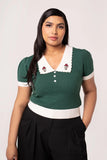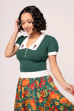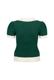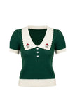 This retro-inspired knitted top features a vibrant green jacquard pattern across the body and sleeves, complemented by contrasting ivory accents on the collar, cuffs, and hem.