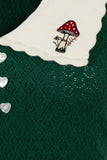 The V-neckline features a pointed, scalloped-edge collar with intricate mushroom embroidery details. Finished with short sleeves, this whimsical top is perfect for dressing up or down.