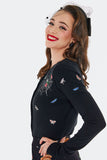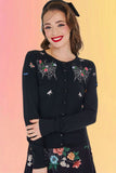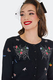 Black round neck long sleeve knitted cardigan with a button front fastening. Featuring a detailed moth, flower and spider web embroidery.
