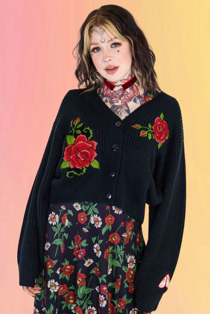 V neck medium weight knitted cardigan in an oversized loose fit with a button front fastening. Featuring two statement rose embroideries on the body and a moth sleeve embroidery detail.