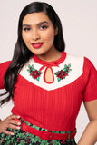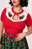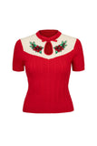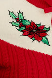 Embrace the holiday season with The Poinsettia Top. This semi-fitted cable knit top comes in a festive red with an ivory chest panel, beautifully embroidered with red holiday flower motifs. It features short sleeves and ribbed detailing on the neckline, cuffs, and hem for a classic finish. The length falls to the hips, making it an easy piece to style for both casual and seasonal occasions.