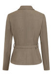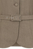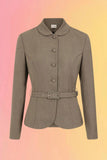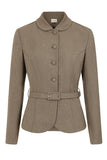 This 40's inspired tailored jacket has a petite peter pan collar, princess seams for feminine fitted shaping and belt and buttons in self fabric .