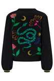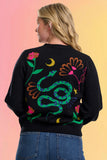 This gorgeous cardigan is a total statement piece...especially if your statement is witchy awesomeness! Featuring a vibrant snake, moon and floral back deign.