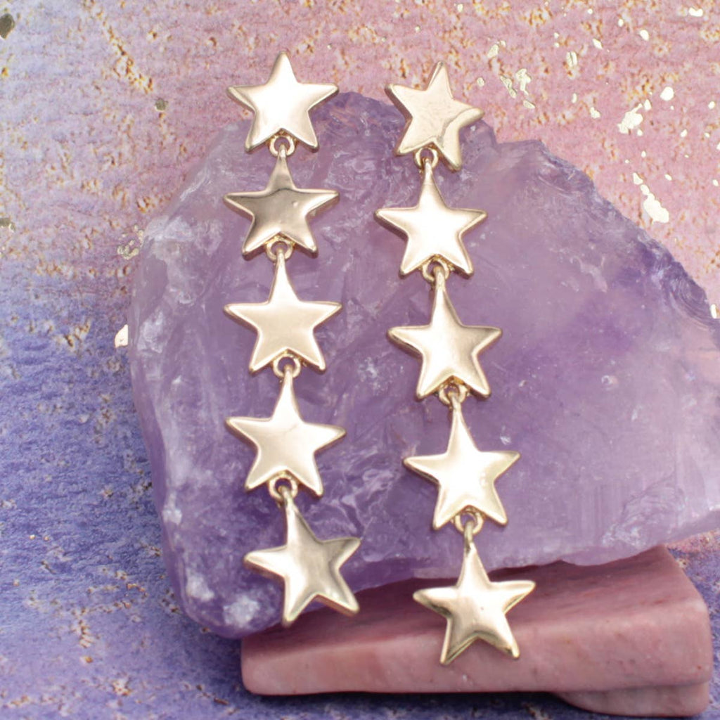 These celestial linear earrings earn five gold stars! Featuring a playful cascade of five golden stars, these earrings bring celestial vibes, retro glam, and a whole lot of sparkle to any look. Give stellar celestial vibes with these gold star post earrings. * Made in China * Gold star earrings * Celestial linear post earrings * Measures (approx.): 2 1/2 x 3/8" * Materials: Gold Tone Metal
