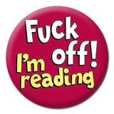 A bright red badge with black outlined white and yellow text that reads Fuck off! I'm reading.