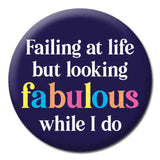 A dark blue badge with smart white and multicoloured text that reads failing at live but looking fabulous while I do.