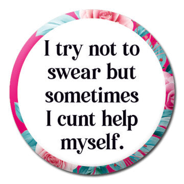 A rude badge with a floral border surrounded a white circle with black text that reads I try not to swear but sometimes I cunt help myself.