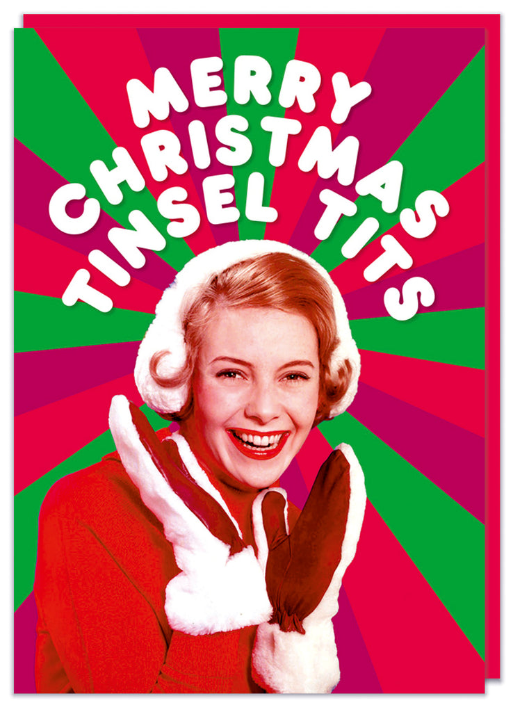 A funny Christmas card featuring a 1960s picture of a smiling young woman with a white hat and furry gloves underneath text that reads Merry Christmas tinsel tits.