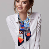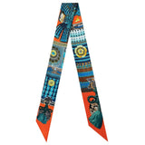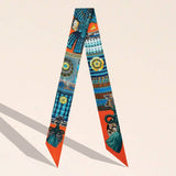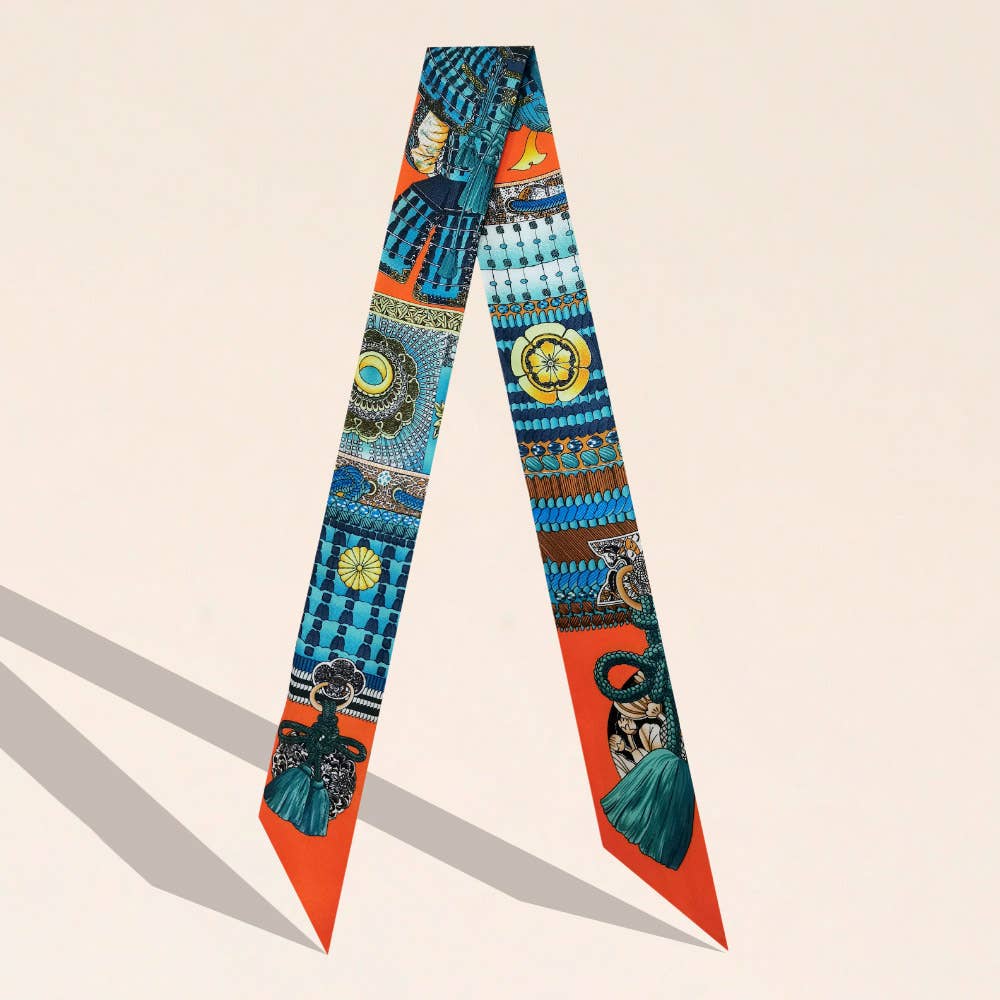 Elevate your style with this luxurious silk twilly scarf, adorned with an intricate tassel and jewel print in rich blue and gold hues. Designed for versatility, this chic silk accessory can be styled as a bag handle wrap, neck scarf, wrist ribbon, or hair tie, adding an elegant touch to any outfit.