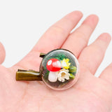 This unique piece showcases a combination of dried flowers and a lifelike simulation of a mushroom, delicately encased in a clear hemisphere glass container.