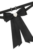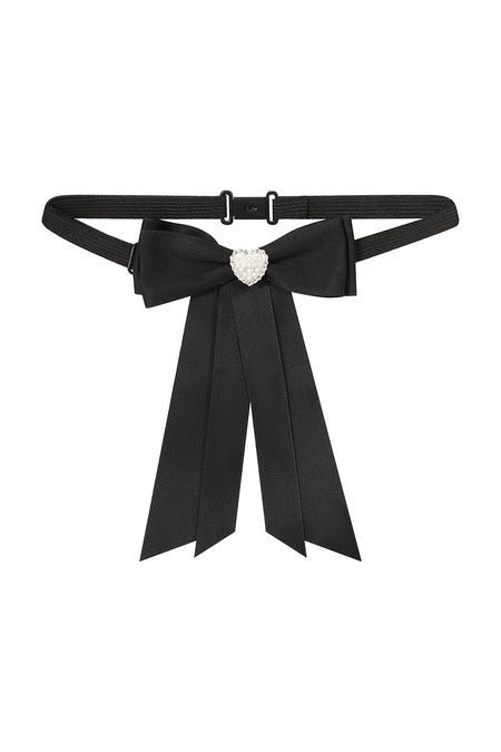 Crafted from sleek black ribbon, this timeless accessory features an elegant oversized bow finished with a sparkling heart-shaped jewel at its center.