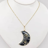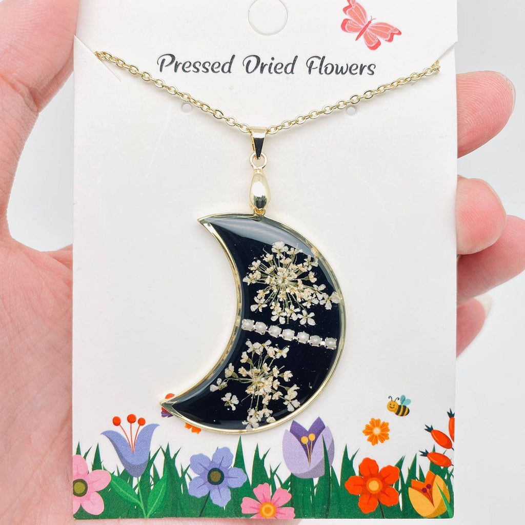 This unique necklace features a black moon-shaped pendant adorned with delicate Queen Anne's Lace flowers encapsulated in resin.
