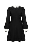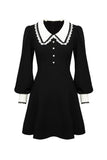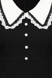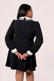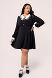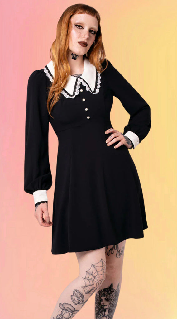 Channel your inner Wednesday with The Anastasia Dress. This bold black mini dress is enhanced with an oversized, pointed collar with decorative lace trim.