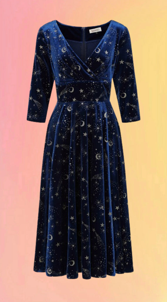 This enchanting 50s-inspired swing dress featuring bespoke glittering celestial print.