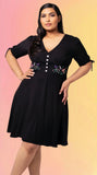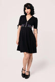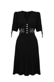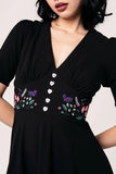 Frolic in The Winnie Dress. This 40’s style midi dress is made from a bold black base, decorated with Autumn foliage embroidery details at the waist.