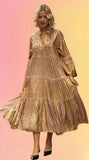 Looks great belted or flowy! Golden, gorgeous, luxurious but so light and airy! This lovely dress from French designers will have you glowing at your next fashionable function!