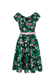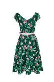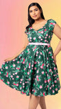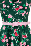 Everything's coming up roses with The Mabel Dress. This dress features a deep green base, decorated with vibrant artwork of blooming red and pink roses.