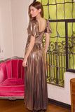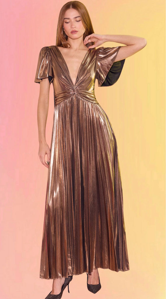 Radiate elegance in this Metallic Twist Front Pleated Maxi Dress, featuring shimmering fabric, a flattering twist-front detail, and flowing pleats for graceful movement.