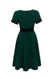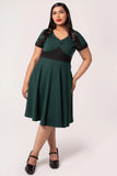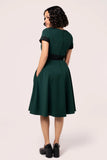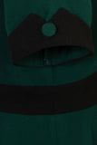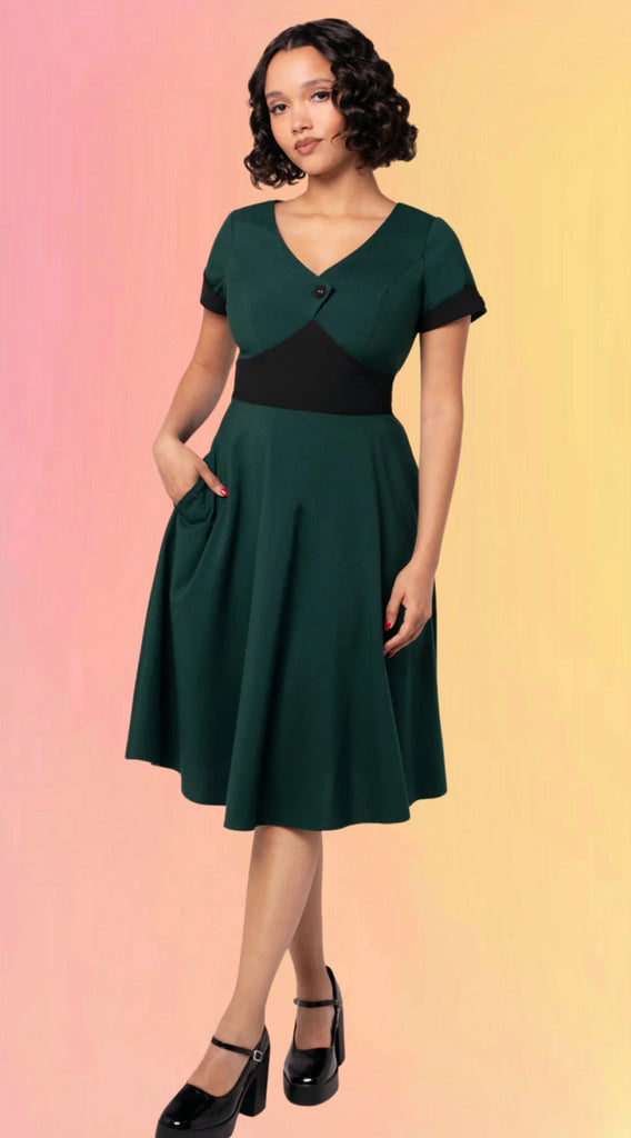 This 50’s style, emerald green midi dress features contrasting black panels on the folded up sleeve cuffs and waist. The V-neckline meets at a black buttoned wrap-over detailing on the bust for a flirty feel. The dress is accentuated with princess seams over the chest, which meet the underbust seam for a flattering fit. The fitted bodice shapes until the waistline, before flowing into a flared skirt with pockets in the side seams for everything you’d need.