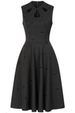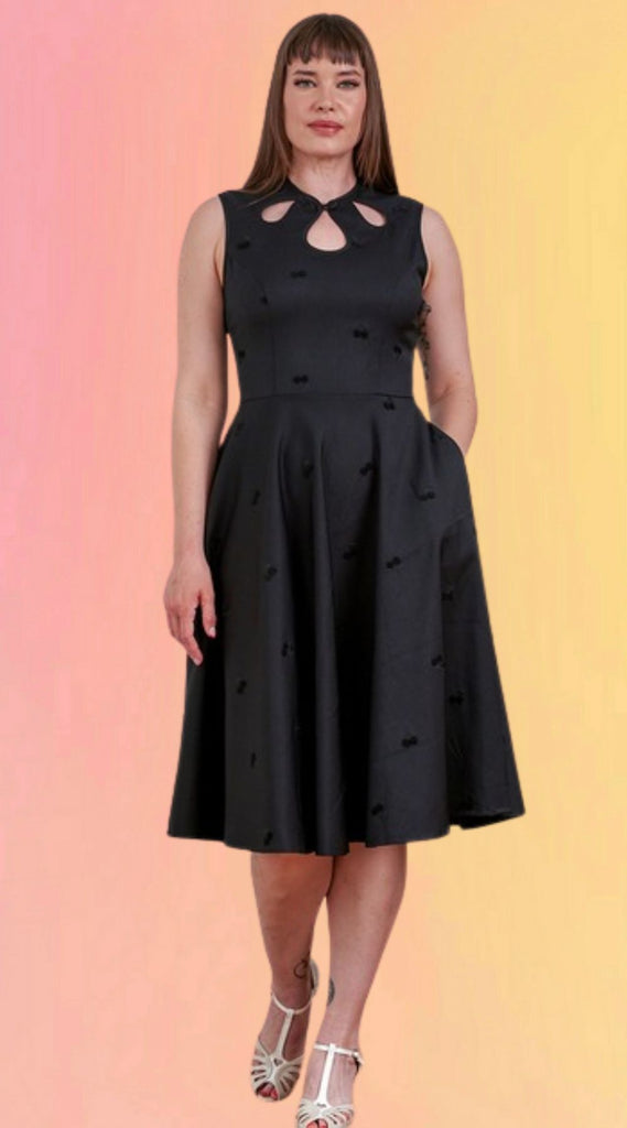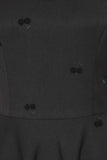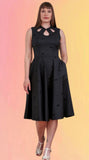 The Daisy dress is back in a beautiful black woven fabric with cherry embroidery. This 1950's inspired fit and flare dress is flattering & perfect for a special event. This sophicated & elegant silhouette is a classic and staple in any retro lovers collection!