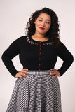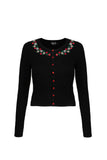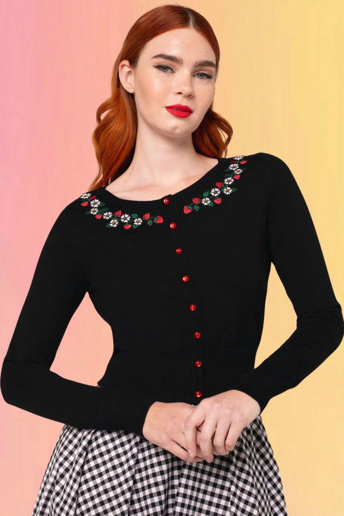 This fitted style, soft knit cardigan features dainty embroidery of ripe strawberries and blooming daisies along the curved collar.