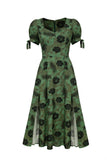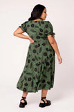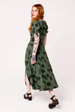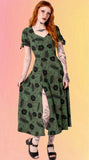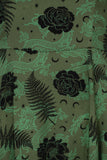 Bring a bit of fantasy to your day with The Georgia Dress. This midi dress features a natural green base, illustrated with artwork of dragons, black foliage, and celestial motifs for an ethereal feel. The sweetheart neckline flatters the chest, before the fitted bodice flows into a midi skirt, emphasised with front slits for added drama. Short puff sleeves are finished with adjustable tie cuffs to fit you just right. Style with your favourite black boots for a grungy feel to suit any occasion.