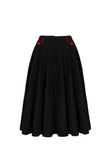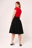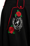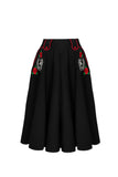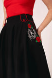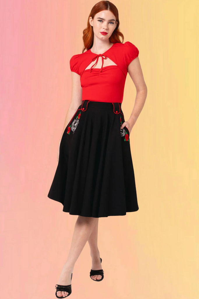 This 50’s style, black bengaline skirt intricate embroidery of horseshoes, scorpions, and roses on the front pockets. Red piping edges the pockets and the belt loops, adding that little touch of drama. The full circle skirt creates volume and flair, perfect for pairing with our petticoats to get that full vintage feel.