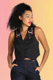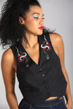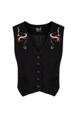 This bold black, semi-fitted waistcoat is cut to the waist, with a sharp V-neckline for added drama. Embellished with twin snake embroidery on the chest, with snake and flaming heart embroidery on the centre back, the timeless iconography creates a bold statement in any look.