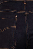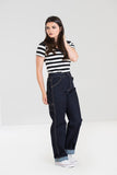 Classic Rockabilly style stretch denim jeans. Decorative tan coloured stitching.  Pockets to sides and back. Decorative 'hammer' loop to side of jeans and additional small tool pocket to back. Tough, pretty and ready to roll!