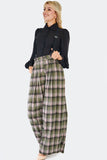 Vintage style extra wide leg trousers made with a green and pink patterned plaid fabric. Featuring a high waisted fit, button and zip fly fastening and detachable PU suspender straps.