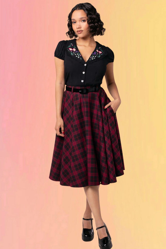 Show your tartan in The Carmina Skirt. This midi skirt features a classic black and red tartan print that is always timeless. The skirt flows from the waistband to create volume, with discreet yet practical pockets in the side seams. Pair it with one of our petticoats for even more drama.