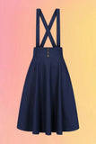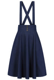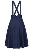 Swing flare high waisted skirt with braces , side seam pockets, button detailing at front waistband.