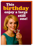 A funny birthday card featuring a retro of a smiling glamorous young woman holding a martini glass with a green dress and posh jewelry. White and yellow text above and beside her reads This birthday enjoy a large stiff one.