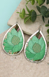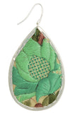 Old world elegance makes this a rich and luxurious fashion earring. Green floral embroidered fabric in silver edged teardrop shape dangles from plain ear wire.