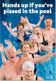 A birthday card with a photo of a mixed group of excited pensioners with their hands up in a swimming pool. The simple text above reads Hands up if you've pissed in the pool
