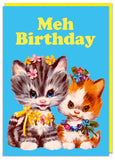 A funny birthday card with a cute whimsical illustration of two kittens against a blue background. Rounded yellow text above them reads Meh birthday.