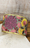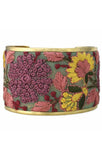 Beautiful vintage style lovingly embordered onto one gorgeous statement bracelet! This elegant gold cuff bracelet features grey mesh ribbon with unique pink and yellow embroidered floral design. Add this crafty cuff bracelet to your wardrobe for a lovely cottage appeal!