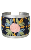 Wide silver flower cross stitch cuff, a charming and artsy accessory that adds a touch of vintage-inspired elegance to your style. This cuff features a wide silver cuff with a delicate pink cross-stitch flower on navy blue burlap background. Wear this crafty cross stitch flower earrings, perfect for those who appreciate the artistry and charm of handcrafted vintage vibes.