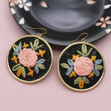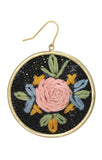 These earrings feature a round shape with a delicate pink cross-stitch flower on black burlap background.