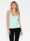 A soft rib V neck cami features a soft lace trim and adjustable straps. Perfect for showing just the right amount of lace under a low cut top.