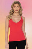 A soft rib V neck cami features a soft lace trim and adjustable straps. Perfect for showing just the right amount of lace under a low cut top.