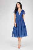A gorgeous cobalt blue midi dress features a deep v-neckline top that meets at a ruched waist and flows into a beautifully layered skirt.